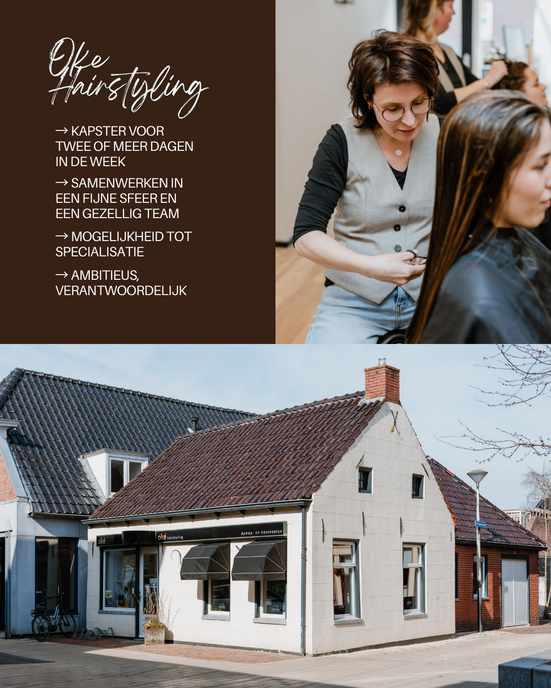 Oké Hairstyling is een kapsalon waar kwaliteit en klanttevredenheid voorop staan. Je komt te werken in een fijne werkomgeving, waarin jij kan groeien en je creativiteit kwijt kan.